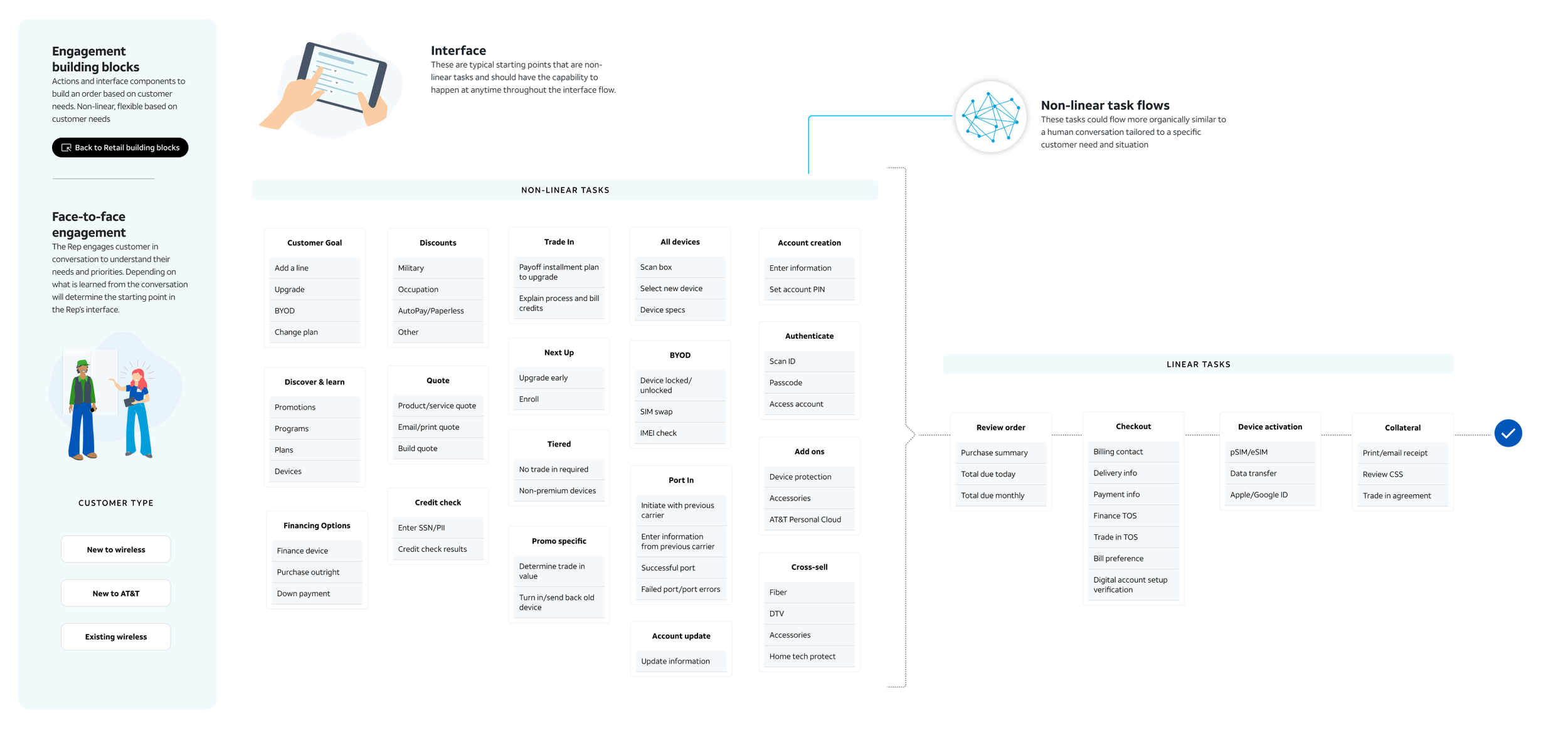 The interface building blocks are made up of linear and non-linear tasks. The non-linear tasks should have the capability to happen at anytime throughout the interface flow to accommodate the rep/customer conversation while the linear tasks are dependent on preceding tasks